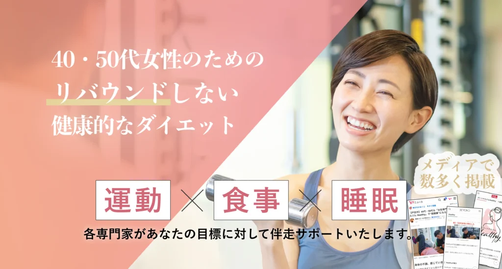 40代を過ぎると「痩せにくい」「疲れが抜けない」「姿勢が悪くなった」と感じる方が増えます。 Healthyでは、インナーマッスル・背中・お尻を鍛えることで、 女性の身体を土台から作っていくトレーニングを行っています。