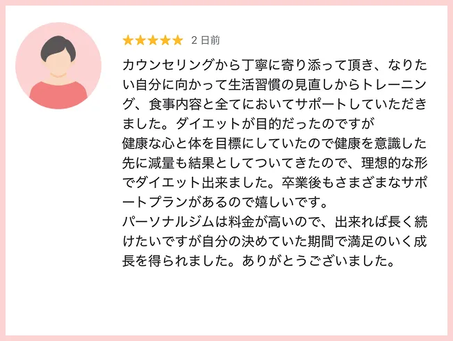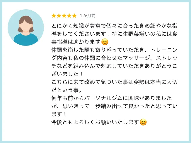 | 得意分野 | ダイエット | ボディメイク | 40・50代女性の「体型」と「姿勢」 を変えるダイエット指導 |