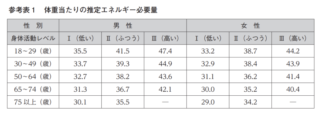 厚労省が出している【体重(kg)あたりの推定必要Kcal】でまずは自分に必要なカロリー量を把握しましょう。